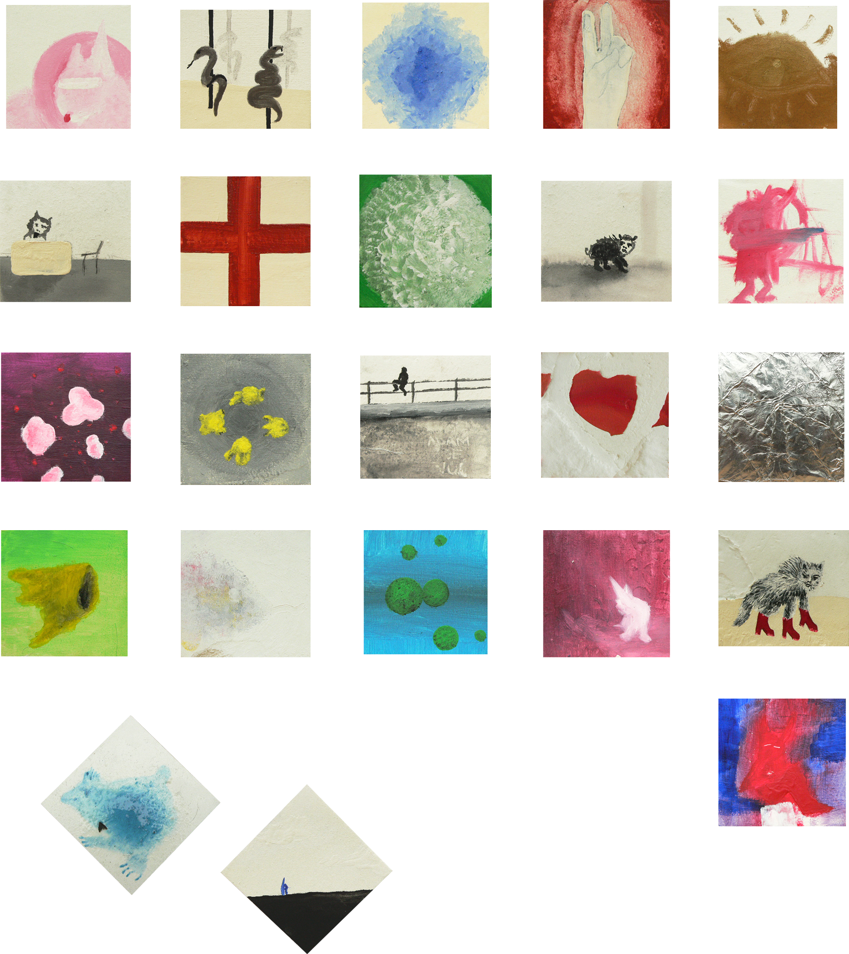 2007 Obrazy / Paintings2007 Kočič, 2007 akryl na plátně 150 × 150 cm Kitter, 2007 acrylic on canvas 150 × 150 cm Můj, 2007 akryl na plátně 90 × 85 cm My, 2007 acrylic on canvas 90 × 85 cm Banán, 2007 akryl na plátně 80 × 95 cm Banana, 2007 acrylic on canvas 80 × 95 cm Pyramidy, 2007 akryl na plátně 70 × 70 cm Pyramids, 2007 acrylic on canvas 70 × 70 cm Mozaika, 2007kombinovaná technika, Kapa10 × 10 cmMosaic, 2007mixed media, Kapa10 × 10 cm Bez názvu, 2007 akryl na plátně 130 × 90 cm Untitled, 2007 acrylic on canvas 130 × 90 cm